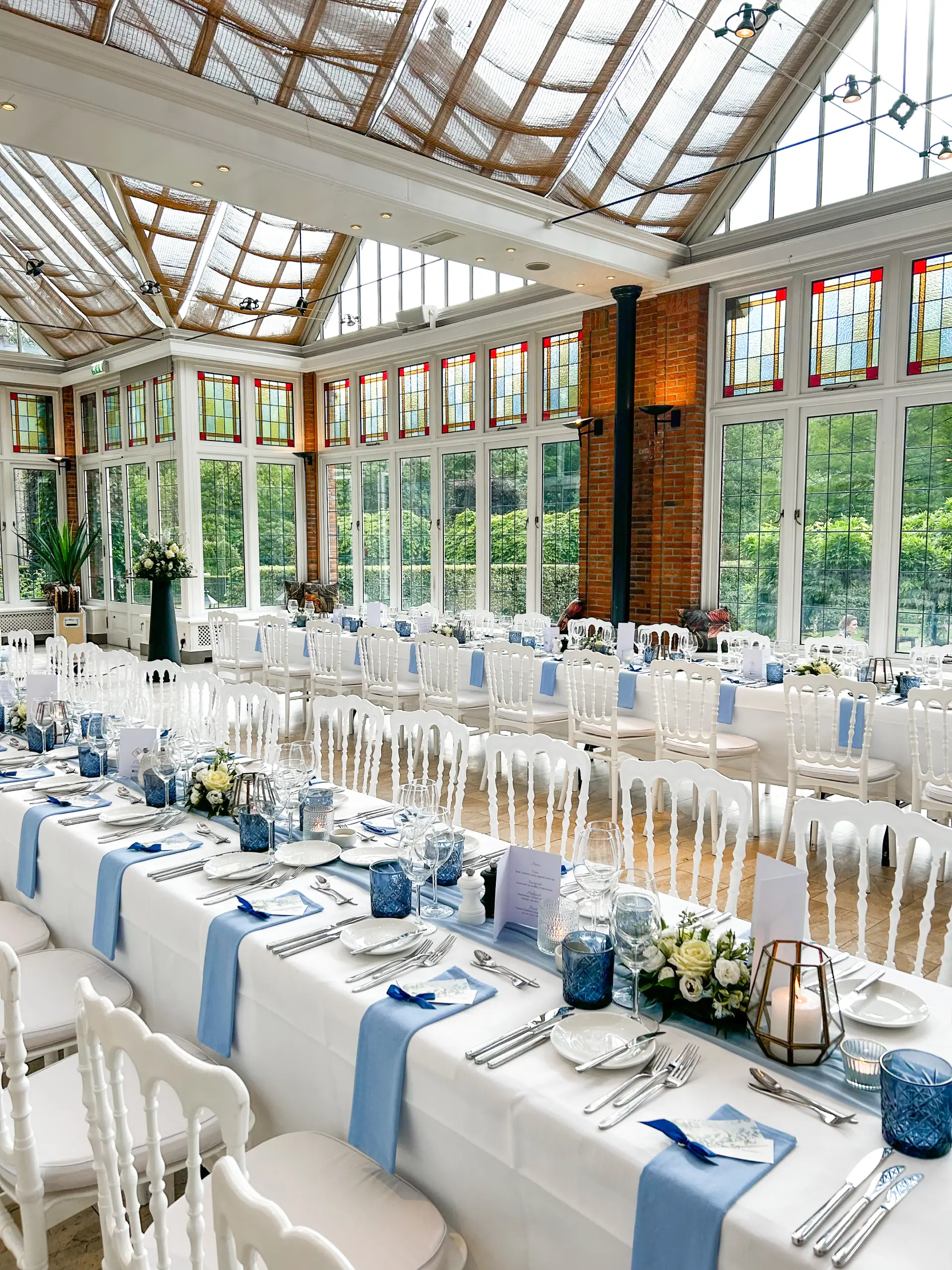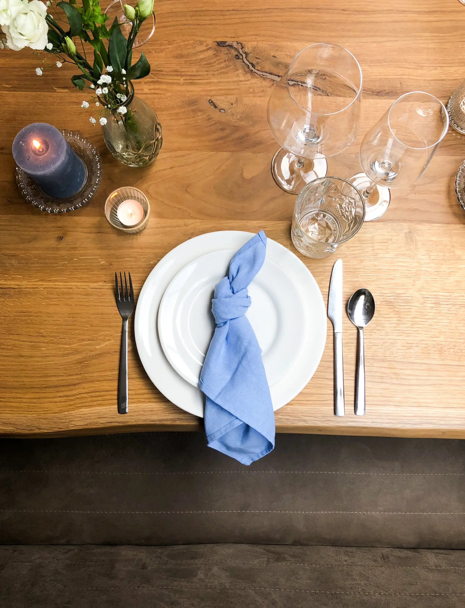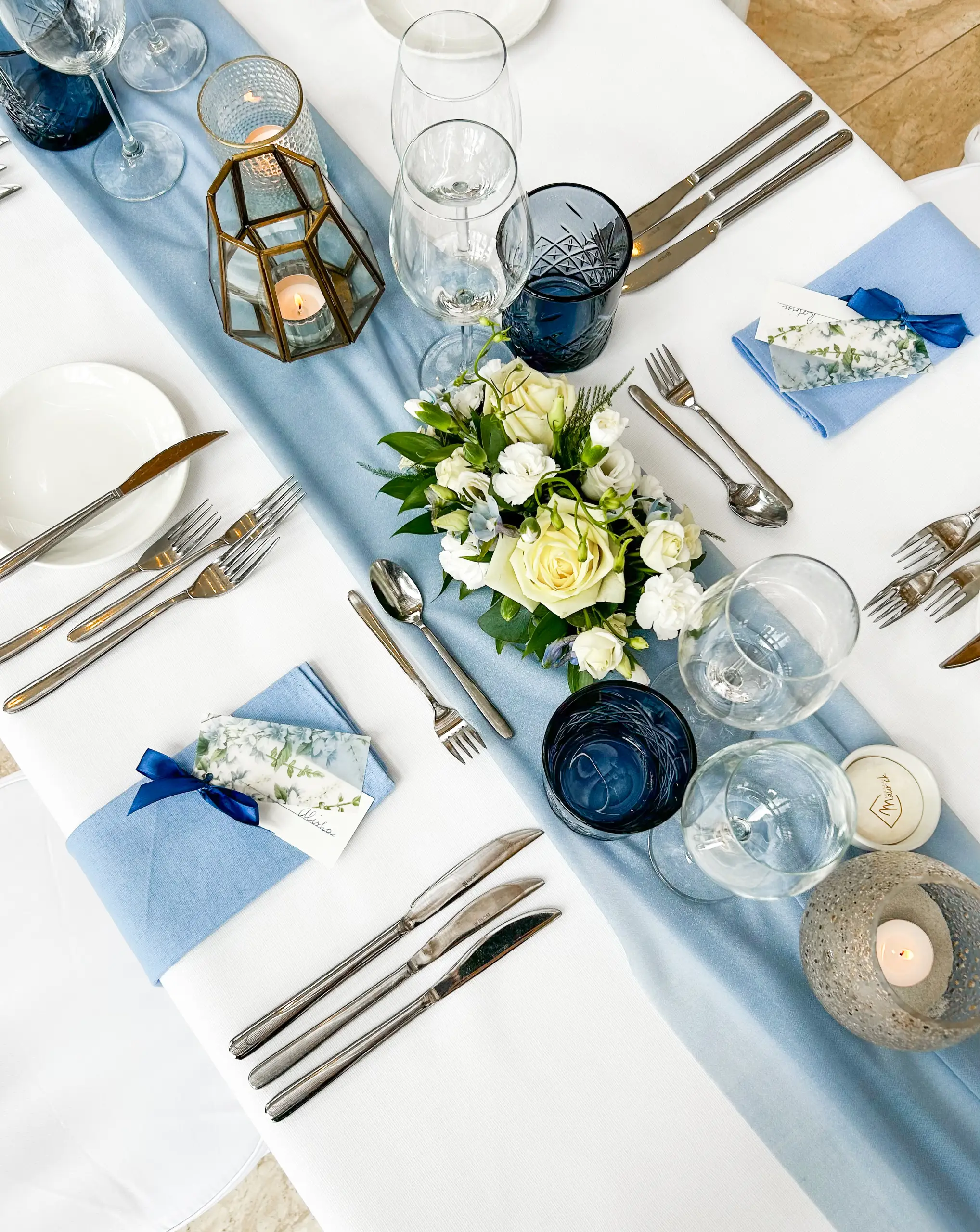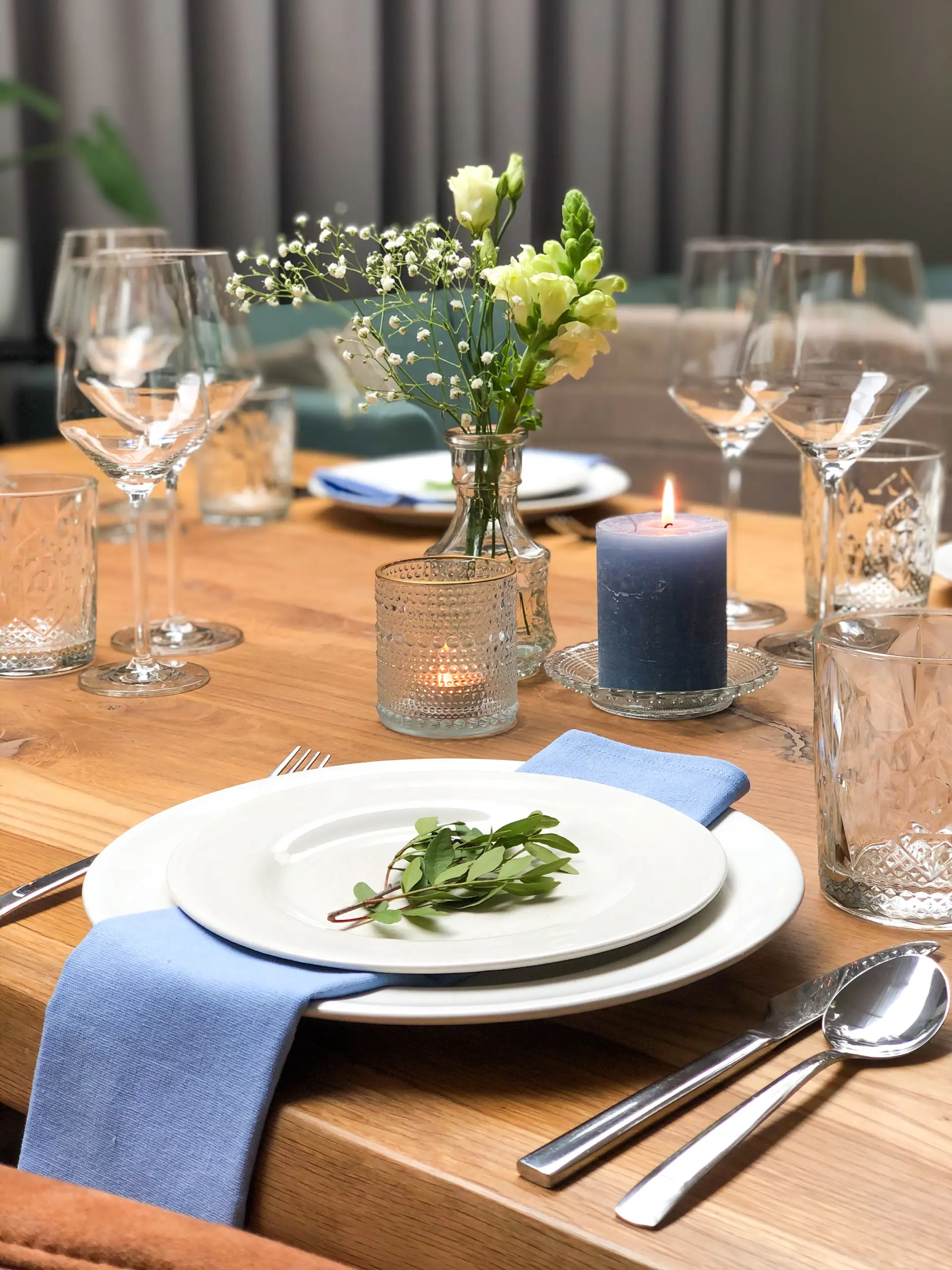 De lichtblauwe servetten zorgen voor een subtiele touch op de toch al gezellige dinertafel.